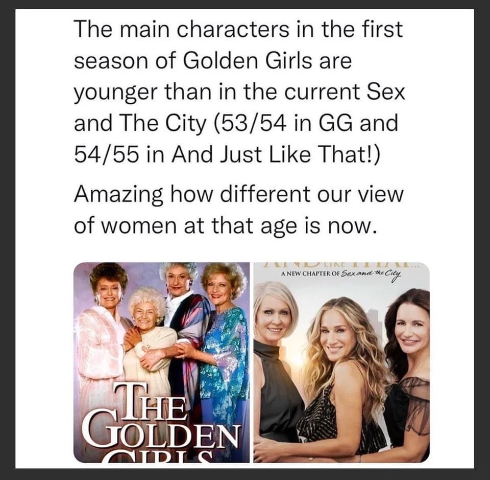 We are kicking off a new series, "Reclaiming Midlife." The concept was inspired by a meme I saw on Facebook - It's of the Golden Girls side by side with the characters of the Sex in the City reboot, And Just Like That. The meme lets us know that both shows' characters are the same age.