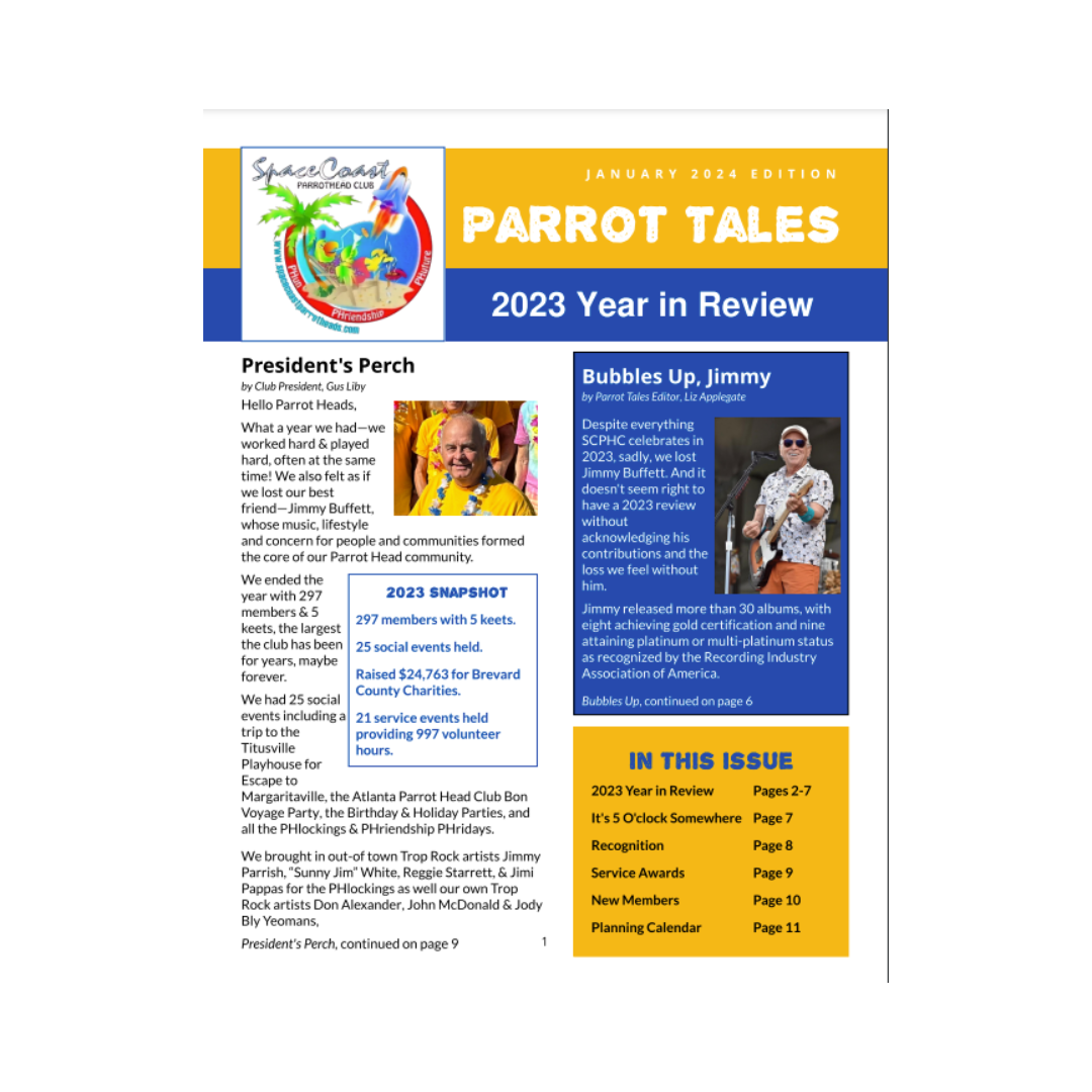 What started as a way to engage with local charity work blossomed into an opportunity to make a lasting impact on the Space Coast Parrot Head Club's communications strategy. As Newsletter Editor for the non-profit, I reimagined their signature publication, "Parrot Tales," transforming it from a basic PowerPoint format into a professionally designed newsletter using Adobe InDesign.