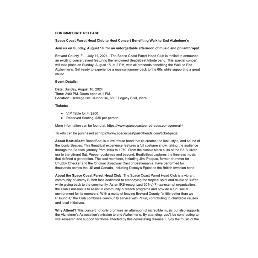 A highlight of my involvement was supporting BeatleBeat, a fundraising event for the 2024 Walk to End Alzheimer's. Alongside newsletter articles and social media, I developed and distributed press releases, across multiple media channels, including local print, online news outlets, and radio stations. This comprehensive media strategy contributed to the event's success, which raised over $16,000 for Alzheimer's research.
